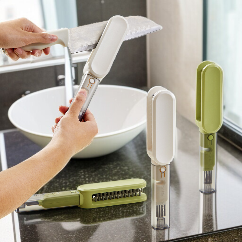 ● 4つの機能を1つに集約!ナイフ洗浄、箸クリーナー、両面ブラシ、ナイフ研ぎ器がこれひとつで完結し、キッチン作業が劇的に効率化します。